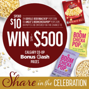 From October 30 to November 26, 2025, open the Calgary Co-op App, activate the challenge, spend $10 on Orville Redenbacher® or Angie’s BOOMCHICKAPOP® popcorn and puffs and you could win one of twenty $500 Calgary Co-op Bonus Cash Prizes!