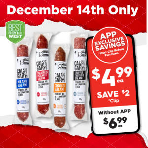 C&G Salami Chubs (170 g) are just $4.99 each*. Perfect for charcuterie boards, festive appetizers, or a savoury snack anytime. Limit of 6.