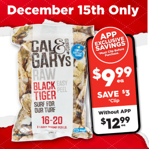 Cal & Gary’s Raw Black Tiger Shrimp (340 g) are just $9.99 each*. Perfect for festive dinners, appetizers, or adding a gourmet touch to any holiday meal. Limit of 6.