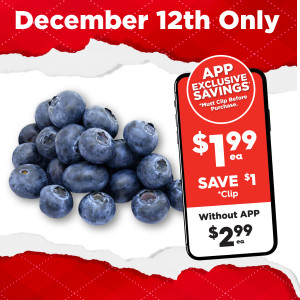 Jumbo Blueberries 170g/60z are just $1.99 each*. Perfect for festive baking, breakfast bowls, or adding a fresh pop of colour to your holiday table. Limit of 6.