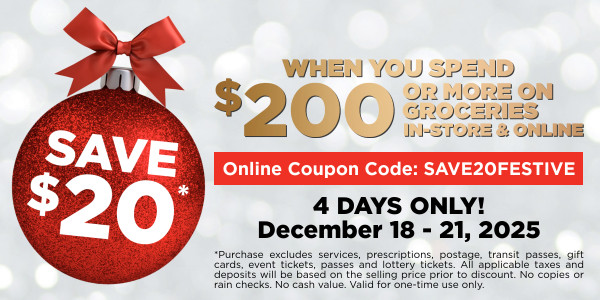 Save $20 when you spend $200 or more on groceries in-store and online. Offer valid December 18- 21, 2025.