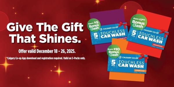 Buy a Gift Pack and earn Calgary Co-op Bonus Cash: $5 with a Regular wash, $7.50 with a Premium wash and $10 with an Extreme wash. The perfect gift to keep their car looking its best – and you get rewarded too! Offer valid December 18 – 26, 2025.