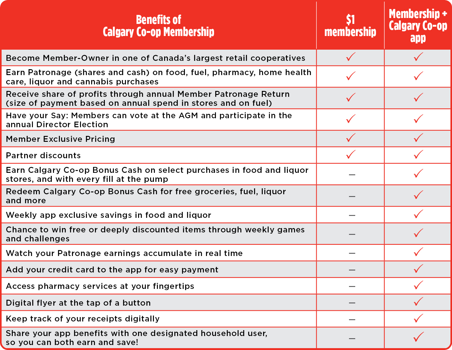 Become a Calgary Co-op member for just $1 and unlock great savings, rewards and support your community. Want to get even more? Members who download the Calgary Co-op App instantly enjoy exclusive savings, personalized deals and $5 Calgary Co-op Bonus Cash!*