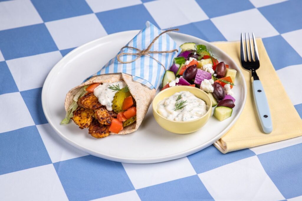 5. To serve, pile tempeh strips onto a warm pitas or flatbread along with shredded lettuce, diced tomato, sliced pickles, wicked white onion and plenty of tzatziki. Fold pita around toppings and